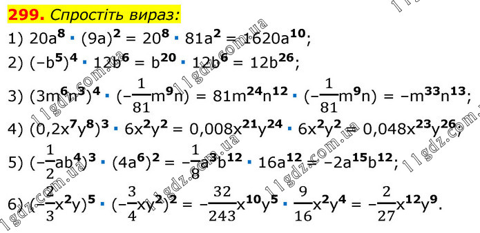 Спростіть вираз: 1) 20a8 ∙ (9a)2 = 208 ∙ 81a2 = 1620a10; 2) (–b5)4 ∙ 12b6 = b20 ∙ 12b6 = 12b26; 3) (3m6n3)4 ∙ (–1/81m9n) = 81m24n12 ∙ (–1/81m9n) = –m33n13; 4) (0,2x7y8)3 ∙ 6x2y2 = 0,008x21y24 ∙ 6x2y2 = 0,048x23y26; 5) (–1/2ab4)3 ∙ (4a6)2 = –1/8a3b12 ∙ 16a12 = –2a15b12; 6) (–2/3x2y)5 ∙ (–3/4xy2)2 = –32/243x10y5 ∙ 9/16x2y4 = –2/27x12y9.
