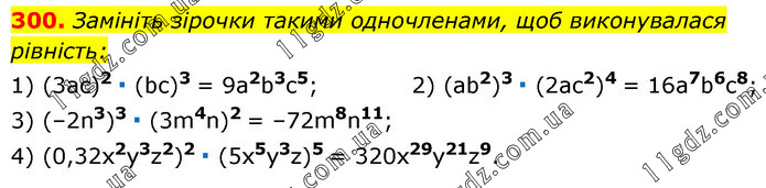 Замініть зірочки такими одночленами, щоб виконувалася рівність: 1) (3ac)2 ∙ (bc)3 = 9a2b3c5; 2) (ab2)3 ∙ (2ac2)4 = 16a7b6c8; 3) (–2n3)3 ∙ (3m4n)2 = –72m8n11; 4) (0,32x2y3z2)2 ∙ (5x5y3z)5 = 320x29y21z9.