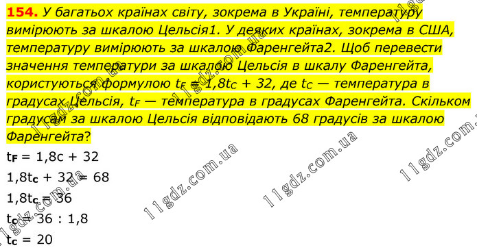 У багатьох країнах світу, зокрема в Україні, температуру вимірюють за шкалою Цельсія1. У деяких країнах, зокрема в США, температуру вимірюють за шкалою Фаренгейта2. Щоб перевести значення температури за шкалою Цельсія в шкалу Фаренгейта, користуються формулою tF = 1,8tC + 32, де tC — температура в градусах Цельсія, tF — температура в градусах Фаренгейта. Скільком градусам за шкалою Цельсія відповідають 68 градусів за шкалою Фаренгейта? tF = 1,8c + 32 1,8tc + 32 = 68 1,8tc = 36 tc = 36 : 1,8 tc = 20
