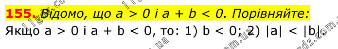 Відомо, що a > 0 і a + b < 0. Порівняйте: Якщо а > 0 і а + b < 0, то: 1) b < 0; 2) |a| < |b|.