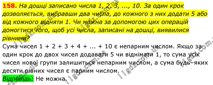 На дошці записано числа 1, 2, 3, ..., 10. За один крок дозволяється, вибравши два числа, до кожного з них додати 5 або від кожного відняти 1. Чи можна за допомогою цих операцій домогтися того, щоб усі числа, записані на дошці, виявилися рівними? Сума чисел 1 + 2 + 3 + 4 + ... + 10 є непарним числом. Якщо за один крок до двох чисел додавати 5 чи віднімати 1, то сума усіх чисел нової групи залишиться непарним числом, а сума будь–яких десяти рівних чисел є парним числом. Відповідь: Не можна.