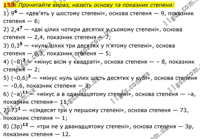 Прочитайте вираз, назвіть основу та показник степеня: 1) 96 — «дев’ять у шостому степені», основа степеня — 9, показник степеня — 6; 2) 2,47 — «дві цілих чотири десятих у сьомому степені», основа степеня — 2,4, показник степеня — 7; 3) 0,35 — «нуль цілих три десятих у п’ятому степені», основа степеня — 0,3, показник степеня — 5; 4) (–8)2 — «мінус вісім у квадраті», основа степеня — – 8, показник степеня — 2; 5) (–0,6)3 — «мінус нуль цілих шість десятих у кубі», основа степеня — –0,6, показник степеня — 3; 6) (–а)11 — «мінус а в одинадцятому степені», основа степеня — –а, показник степеня— 11; 7) 731 — «сімдесят три у першому степені», основа степеня — 73, показник степеня — 1; 8) (Зр)12 — «три пе у дванадцятому степені», основа степеня — Зр, показник степеня — 12.