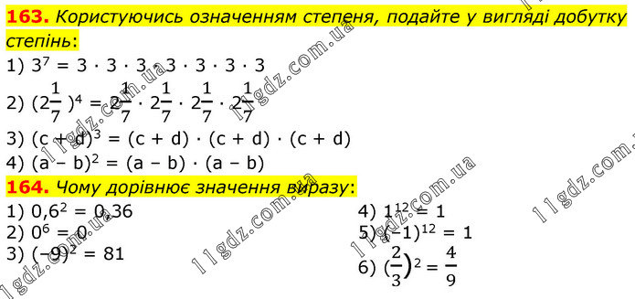 163. Користуючись означенням степеня, подайте у вигляді добутку степінь: 1) 37 = 3 ∙ 3 ∙ 3 ∙ 3 ∙ 3 ∙ 3 ∙ 3 2) (21/7 )4 = 21/7 ∙ 21/7 ∙ 21/7 ∙ 21/7 3) (c + d)3 = (c + d) ∙ (c + d) ∙ (c + d) 4) (a – b)2 = (a – b) ∙ (a – b) 164. Чому дорівнює значення виразу: 1) 0,62 = 0,36 2) 06 = 0 3) (–9)2 = 81 4) 112 = 1 5) (–1)12 = 1 6) (2/3)2 = 4/9