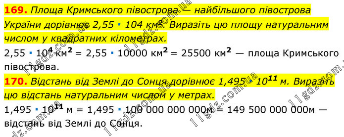 169. Площа Кримського півострова — найбільшого півострова України дорівнює 2,55 ∙ 104 км2. Виразіть цю площу натуральним числом у квадратних кілометрах. 2,55 ∙ 104 км2 = 2,55 ∙ 10000 км2 = 25500 км2 — площа Кримського півострова. 170. Відстань від Землі до Сонця дорівнює 1,495 ∙ 1011 м. Виразіть цю відстань натуральним числом у метрах. 1,495 ∙ 1011 м = 1,495 ∙ 100 000 000 000м = 149 500 000 000м — відстань від Землі до Сонця.