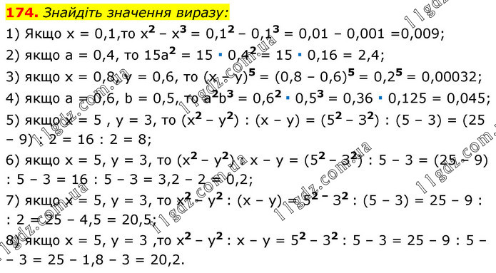 Знайдіть значення виразу: 1) Якщо х = 0,1,то x2 – х3 = 0,12 – 0,13 = 0,01 – 0,001 =0,009; 2) якщо а = 0,4, то 15a2 = 15 ∙ 0,42 = 15 ∙ 0,16 = 2,4; 3) якщо x = 0,8, y = 0,6, то (x – y)5 = (0,8 – 0,6)5 = 0,25 = 0,00032; 4) якщо а = 0,6, b = 0,5, то а2b3 = 0,62 ∙ 0,53 = 0,36 ∙ 0,125 = 0,045; 5) якщо х = 5 , y = 3, то (х2 – у2) : (х – у) = (52 – З2) : (5 – 3) = (25 – 9) : 2 = 16 : 2 = 8; 6) якщо х = 5, y = 3, то (х2 – у2) : х – у = (52 – З2) : 5 – 3 = (25 – 9) : 5 – 3 = 16 : 5 – З = 3,2 – 2 = 0,2; 7) якщо x = 5, y = 3, то x2 – y2 : (х – у) = 52 – З2 : (5 – 3) = 25 – 9 : : 2 = 25 – 4,5 = 20,5; 8) якщо x = 5, у = 3 ,то х2 – у2 : х – у = 52 – 32 : 5 – 3 = 25 – 9 : 5 – – 3 = 25 – 1,8 – 3 = 20,2.