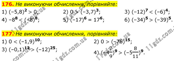 176. Не виконуючи обчислення, порівняйте: 1) (–5,8)2 > 0; 4) –88 < (–8)8; 2) 0 > (–3,7)3; 5) (–17)6 = 176; 3) (–12)7 < (–6)4; 6) (–34)5 > (–39)5. 177. Не виконуючи обчислення, порівняйте: 1) 0 < (–1,9)10; 3) (–0,1)12 > (–12)25; 2) 0 > (–76)15; 4) (–47/9)9 > (–58/11)9.