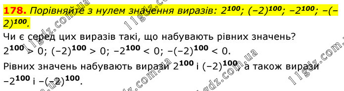 Порівняйте з нулем значення виразів: 2100; (–2)100; –2100; –(–2)100. Чи є серед цих виразів такі, що набувають рівних значень? 2100 > 0; (–2)100 > 0; –2100 < 0; –(–2)100 < 0. Рівних значень набувають вирази 2100 і (–2)100, а також вирази –2100 і –(–2)100.