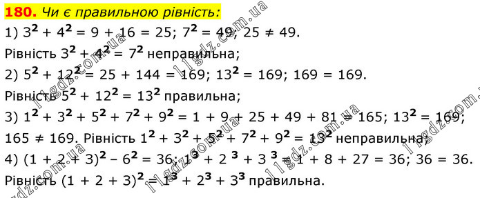 Чи є правильною рівність: 1) З2 + 42 = 9 + 16 = 25; 72 = 49; 25 ≠ 49. Рівність З2 + 42 = 72 неправильна; 2) 52 + 122 = 25 + 144 = 169; 132 = 169; 169 = 169. Рівність 52 + 122 = 132 правильна; 3) 12 + 32 + 52 + 72 + 92 = 1 + 9 + 25 + 49 + 81 = 165; 132 = 169; 165 ≠ 169. Рівність 12 + З2 + 52 + 72 + 92 = 132 неправильна; 4) (1 + 2 + З)2 – 62 = 36; 13 + 2 3 + З 3 = 1 + 8 + 27 = 36; 36 = 36. Рівність (1 + 2 + З)2 = 13 + 23 + З3 правильна.