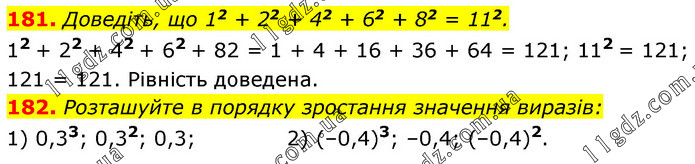 181. Доведіть, що 12 + 22 + 42 + 62 + 82 = 112. 12 + 22 + 42 + 62 + 82 = 1 + 4 + 16 + 36 + 64 = 121; 112 = 121; 121 = 121. Рівність доведена. 182. Розташуйте в порядку зростання значення виразів: 1) 0,33; 0,32; 0,3; 2) (–0,4)3; –0,4; (–0,4)2.
