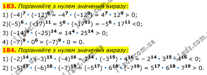 183. Порівняйте з нулем значення виразу: 1) (–4)7 ∙ (–12)9 = –47 ∙ (–129) = 47 ∙ 129 > 0; 2)(–5)6 ∙ (–17)11 = 56 ∙ (–1711) = –56 ∙ 1711 <0; 3) (–14)4 ∙ (–25)14 = 144 ∙ 2514 > 0; 4) (–7)9 ∙ 06 = (–7)9 ∙ 0 = 0. 184. Порівняйте з нулем значення виразу: 1) (–2)14 ∙ (–3)15 ∙ (–4)16 = 214 ∙ (–315) ∙ 416 = – 214 ∙ З15 ∙ 416 < 0; 2) (–5)17 ∙ (–6)18 ∙ (–7)19 = (–517) ∙ 618 ∙ (–719) = 517 ∙ 618 ∙ 719 > 0.