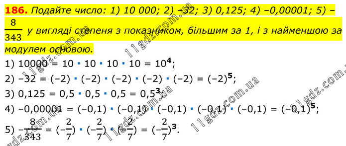 Подайте число: 1) 10 000; 2) –32; 3) 0,125; 4) –0,00001; 5) –8/343 у вигляді степеня з показником, більшим за 1, і з найменшою за модулем основою. 1) 10000 = 10 ∙ 10 ∙ 10 ∙ 10 = 104; 2) –32 = (–2) ∙ (–2) ∙ (–2) ∙ (–2) ∙ (–2) = (–2)5; 3) 0,125 = 0,5 ∙ 0,5 ∙ 0,5 = 0,53; 4) –0,00001 = (–0,1) ∙ (–0,1) ∙ (–0,1) ∙ (–0,1) ∙ (–0,1) = (–0,1)5; 5) –8/343 = (–2/7) ∙ (–2/7) ∙ (–2/7) = (–2/7)3.