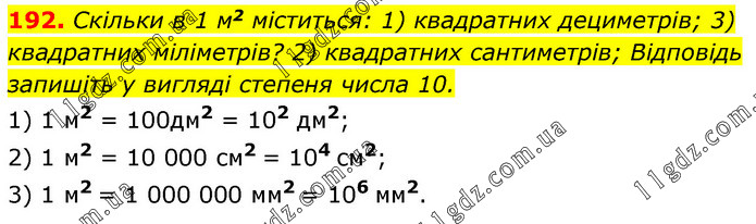 Скільки в 1 м2 міститься: 1) квадратних дециметрів; 3) квадратних міліметрів? 2) квадратних сантиметрів; Відповідь запишіть у вигляді степеня числа 10. 1) 1 м2 = 100дм2 = 102 дм2; 2) 1 м2 = 10 000 см2 = 104 см2; 3) 1 м2 = 1 000 000 мм2 = 106 мм2.
