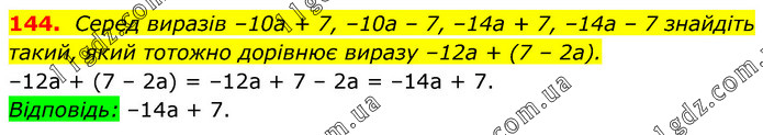 Серед виразів –10a + 7, –10a – 7, –14a + 7, –14a – 7 знайдіть такий, який тотожно дорівнює виразу –12a + (7 – 2a). –12а + (7 – 2а) = –12а + 7 – 2а = –14а + 7. Відповідь: –14а + 7.