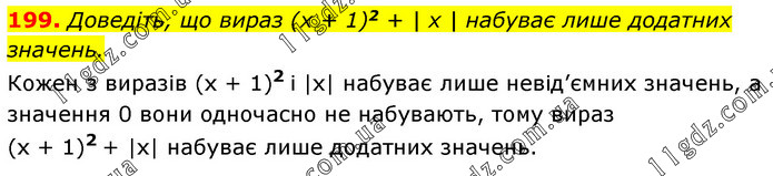 Доведіть, що вираз (x + 1)2 + | x | набуває лише додатних значень. Кожен з виразів (х + 1)2 і |х| набуває лише невід’ємних значень, а значення 0 вони одночасно не набувають, тому вираз (х + 1)2 + |х| набуває лише додатних значень.