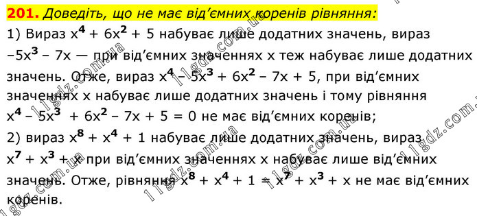 Доведіть, що не має від’ємних коренів рівняння: 1) Вираз x4 + 6х2 + 5 набуває лише додатних значень, вираз –5х3 – 7х — при від’ємних значеннях х теж набуває лише додатних значень. Отже, вираз х4 – 5х3 + 6х2 – 7х + 5, при від’ємних значеннях х набуває лише додатних значень і тому рівняння х4 – 5x3 + 6х2 – 7х + 5 = 0 не має від’ємних коренів; 2) вираз х8 + х4 + 1 набуває лише додатних значень, вираз х7 + х3 + х при від’ємних значеннях х набуває лише від’ємних значень. Отже, рівняння x8 + х4 + 1 = х7 + х3 + х не має від’ємних коренів.