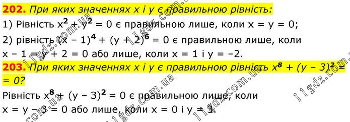202. При яких значеннях x і y є правильною рівність: 1) Рівність х2 + у2 = 0 є правильною лише, коли х = у = 0; 2) рівність (х – 1)4 + (у + 2)6 = 0 є правильною лише, коли х – 1 = у + 2 = 0 або лише, коли х = 1 і у = –2. 203. При яких значеннях x і y є правильною рівність x8 + (y – 3)2 = = 0? Рівність x8 + (у – З)2 = 0 є правильною лише, коли х = у – 3 = 0 або лише, коли х = 0 i у = 3.