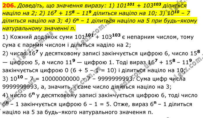 Доведіть, що значення виразу: 1) 101101 + 103103 ділиться націло на 2; 2) 167 + 158 – 119 ділиться націло на 10; 3) 1010 – 7 ділиться націло на 3; 4) 6n – 1 ділиться націло на 5 при будь–якому натуральному значенні n. 1) Кожний доданок суми 101101 + 10З103 є непарним числом, тому сума є парним числом і ділиться наділо на 2; 2) число 167 у десятковому записі закінчується цифрою 6, число 158 — цифрою 5, а число 119 — цифрою 1. Тоді вираз 167 + 158 – 119 закінчується цифрою 0 (6 + 5 – 1 = 10) і ділиться націло на 10; 3) 1010 – 7 = 10000000000 – 7 – 9999999993. Сума цифр числа 9999999993, а, значить, і саме число ділиться націло на 3; 4) число 6n у десятковому записі закінчується цифрою 6, тоді число 6n – 1 закінчується цифрою 6 – 1 = 5. Отже, вираз 6n – 1 ділиться націло на 5 за будь–якого натурального значення n.