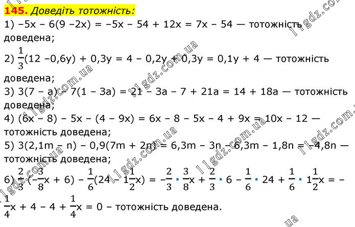 Доведіть тотожність: 1) –5x – 6(9 –2x) = –5x – 54 + 12x = 7x – 54 — тотожність доведена; 2) 1/3(12 –0,6y) + 0,3y = 4 – 0,2y + 0,3y = 0,1y + 4 — тотожність доведена; 3) 3(7 – а) – 7(1 – За) = 21 – За – 7 + 21а = 14 + 18а — тотожність доведена; 4) (6х – 8) – 5x – (4 – 9x) = 6х – 8 – 5х – 4 + 9x = 10х – 12 — тотожність доведена; 5) 3(2,1m – n) – 0,9(7m + 2n) = 6,3m – 3n – 6,3m – 1,8n = –4,8n — тотожність доведена; 6) 2/3 (–3/8x + 6) – 1/6(24 – 11/2x) = –2/3 ∙ 3/8x + 2/3 ∙ 6 – 1/6 ∙ 24 + 1/6 ∙ 11/2x = –1/4x + 4 – 4 + 1/4x = 0 – тотожність доведена.
