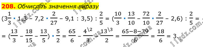 Обчисліть значення виразу (31/3 ∙ 1,3 – 7,2 ∙ 2/27 – 9,1 : 3,5) : 2/5 = (10/3 ∙ 13/10 – 72/10 ∙ 2/27 – 2,6) : 2/5 = = (13/3 – 18/15 – 13/5) ∙ 5/2 = 65/6 – 4^(\2)/3 – 13^(\3)/2 = (65-8-39)/6 = 18/6 = 3.