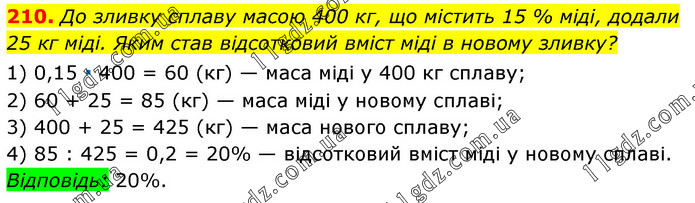 До зливку сплаву масою 400 кг, що містить 15 % міді, додали 25 кг міді. Яким став відсотковий вміст міді в новому зливку? 1) 0,15 ∙ 400 = 60 (кг) — маса міді у 400 кг сплаву; 2) 60 + 25 = 85 (кг) — маса міді у новому сплаві; 3) 400 + 25 = 425 (кг) — маса нового сплаву; 4) 85 : 425 = 0,2 = 20% — відсотковий вміст міді у новому сплаві. Відповідь: 20%.
