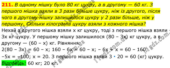 В одному мішку було 80 кг цукру, а в другому — 60 кг. З першого мішка взяли в 3 рази більше цукру, ніж із другого, після чого в другому мішку залишилося цукру у 2 рази більше, ніж у першому. Скільки кілограмів цукру взяли з кожного мішка? Нехай з другого мішка взяли х кг цукру, тоді з першого мішка взяли Зх кг цукру. У першому мішку залишилося (80 – Зх) кг цукру, а в другому — (60 – х) кг. Рівняння: 2(80 – Зх) = 60 – х; 160 – 6х = 60 – х; – 6х + х = 60 – 160; –5х = –100; х = 20. З першого мішка взяли 3 ∙ 20 = 60 (кг) цукру. Відповідь: 60 кг; 20 кг.