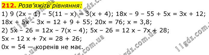 Розв’яжіть рівняння: 1) 9 (2х – 1) – 5(11 – х) = 3(х + 4); 18x – 9 – 55 + 5x = Зх + 12; 18х + 5х – Зх = 12 + 9 + 55; 20х = 76; x = 3,8; 2) 5х – 26 = 12x – 7(х – 4); 5х – 26 = 12 x – 7х + 28; 5х – 12 х + 7х = 28 + 26; 0х = 54 — коренів не має.
