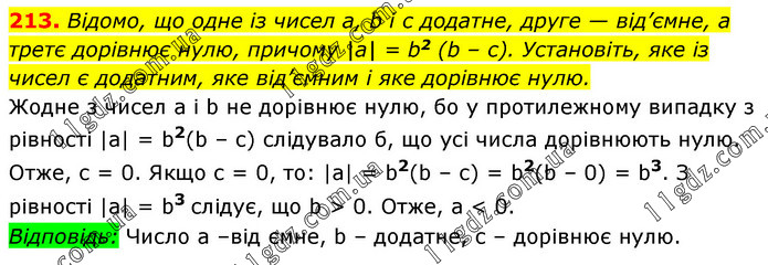 Відомо, що одне із чисел a, b і c додатне, друге — від’ємне, а третє дорівнює нулю, причому |a| = b2 (b – c). Установіть, яке із чисел є додатним, яке від’ємним і яке дорівнює нулю. Жодне з чисел а і b не дорівнює нулю, бо у протилежному випадку з рівності |a| = b2(b – с) слідувало б, що усі числа дорівнюють нулю. Отже, с = 0. Якщо с = 0, то: |a| = b2(b – с) = b2(b – 0) = b3. З рівності |a| = b3 слідує, що b > 0. Отже, а < 0. Відповідь: Число а –від ємне, b – додатне, с – дорівнює нулю.