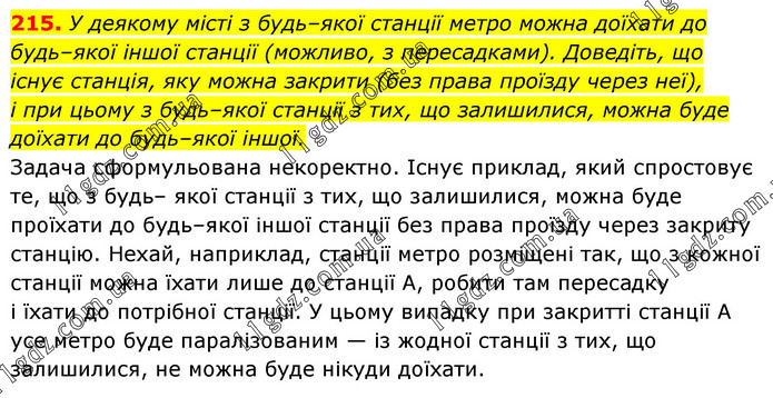 У деякому місті з будь–якої станції метро можна доїхати до будь–якої іншої станції (можливо, з пересадками). Доведіть, що існує станція, яку можна закрити (без права проїзду через неї), і при цьому з будь–якої станції з тих, що залишилися, можна буде доїхати до будь–якої іншої. Задача сформульована некоректно. Існує приклад, який спростовує те, що з будь– якої станції з тих, що залишилися, можна буде проїхати до будь–якої іншої станції без права проїзду через закриту станцію. Нехай, наприклад, станції метро розміщені так, що з кожної станції можна їхати лише до станції А, робити там пересадку і їхати до потрібної станції. У цьому випадку при закритті станції A усе метро буде паралізованим — із жодної станції з тих, що залишилися, не можна буде нікуди доїхати.