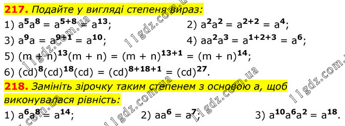 217. Подайте у вигляді степеня вираз: 1) a5a8 = a5+8 = a13; 3) a9a = a9+1 = a10; 2) a2a2 = a2+2 = a4; 4) aa2a3 = a1+2+3 = a6; 5) (m + n)13(m + n) = (m + n)13+1 = (m + n)14; 6) (cd)8(cd)18(cd) = (cd)8+18+1 = (cd)27. 218. Замініть зірочку таким степенем з основою a, щоб виконувалася рівність: 1) a6a8 = a14; 2) aa6 = a7; 3) a10a6a2 = a18.