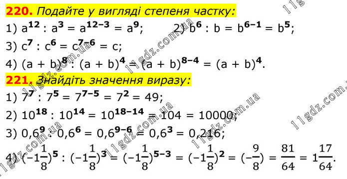 220. Подайте у вигляді степеня частку: 1) a12 : a3 = a12–3 = a9; 3) c7 : c6 = c7–6 = c; 2) b6 : b = b6–1 = b5; 4) (a + b)8 : (a + b)4 = (a + b)8–4 = (a + b)4. 221. Знайдіть значення виразу: 1) 77 : 75 = 77–5 = 72 = 49; 2) 1018 : 1014 = 1018–14 = 104 = 10000; 3) 0,69 : 0,66 = 0,69–6 = 0,63 = 0,216; 4) (–11/8)5 : (–11/8)3 = (–11/8)5–3 = (–11/8)2 = (–9/8) = 81/64 = 117/64.