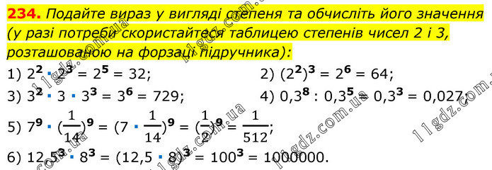 Подайте вираз у вигляді степеня та обчисліть його значення (у разі потреби скористайтеся таблицею степенів чисел 2 і 3, розташованою на форзаці підручника): 1) 22 ∙ 23 = 25 = 32; 3) 32 ∙ 3 ∙ 33 = 36 = 729; 2) (22)3 = 26 = 64; 4) 0,38 : 0,35 = 0,33 = 0,027; 5) 79 ∙ (1/14)9 = (7 ∙ 1/14)9 = (1/2)9 = 1/512; 6) 12,53 ∙ 83 = (12,5 ∙ 8)3 = 1003 = 1000000.