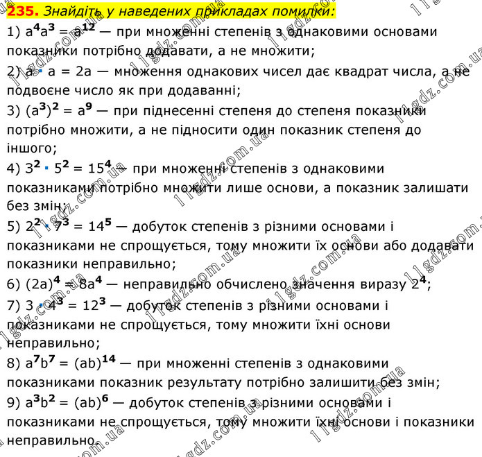 Знайдіть у наведених прикладах помилки: 1) a4a3 = a12 — при множенні степенів з однаковими основами показники потрібно додавати, а не множити; 2) а ∙ а = 2а — множення однакових чисел дає квадрат числа, а не подвоєне число як при додаванні; 3) (а3)2 = а9 — при піднесенні степеня до степеня показники потрібно множити, а не підносити один показник степеня до іншого; 4) З2 ∙ 52 = 154 — при множенні степенів з однаковими показниками потрібно множити лише основи, а показник залишати без змін; 5) 22 ∙ 73 = 145 — добуток степенів з різними основами і показниками не спрощується, тому множити їх основи або додавати показники неправильно; 6) (2а)4 = 8а4 — неправильно обчислено значення виразу 24; 7) 3 ∙ 43 = 123 — добуток степенів з різними основами і показниками не спрощується, тому множити їхні основи неправильно; 8) а7b7 = (аb)14 — при множенні степенів з однаковими показниками показник результату потрібно залишити без змін; 9) а3b2 = (ab)6 — добуток степенів з різними основами і показниками не спрощується, тому множити їхні основи і показники неправильно.