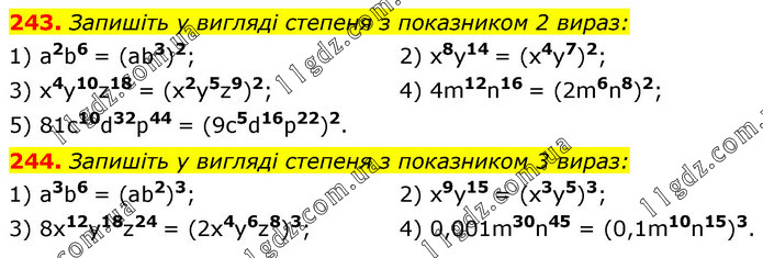 243. Запишіть у вигляді степеня з показником 2 вираз: 1) a2b6 = (ab3)2; 3) x4y10z18 = (x2y5z9)2; 5) 81c10d32p44 = (9c5d16p22)2. 2) x8y14 = (x4y7)2; 4) 4m12n16 = (2m6n8)2; 244. Запишіть у вигляді степеня з показником 3 вираз: 1) a3b6 = (ab2)3; 3) 8x12y18z24 = (2x4y6z8)3; 2) x9y15 = (x3y5)3; 4) 0,001m30n45 = (0,1m10n15)3.