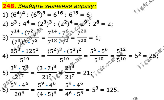 Знайдіть значення виразу: 1) (64)4 : (65)3 = 616 : 615 = 6; 2) 83 : 44 = (23)3 : (22)4 = 29 : 28 = 2; 3) (7^14 • (7^2 )^3)/((7^3 )^6 • 7^2 ) = (7^14 • 7^6)/(7^18 • 7^2 ) = 7^20/7^20 = 1; 4) (25^3 • 125^2)/5^10 = ((5^2 )^3 • (5^3 )^2)/5^10 = (5^6 • 5^6)/5^10 = 5^12/5^10 = 52 = 25; 5) (3^8 • 7^8)/21^7 = ((3 • 7)^8)/21^7 = 21^8/21^7 = 21; 6) (5^9 • 4^6)/20^6 = (5^9 • 4^6)/((4 • 5)^6 ) = (5^9 • 4^6)/(4^6 • 5^6 ) = 53 = 125.