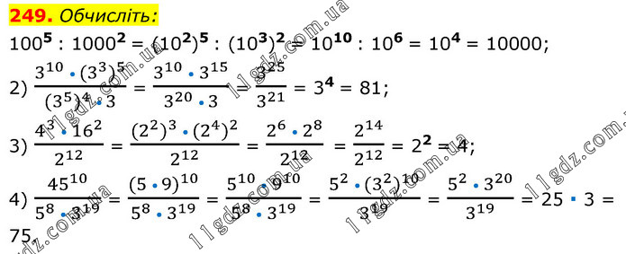 Обчисліть: 1005 : 10002 = (102)5 : (103)2 = 1010 : 106 = 104 = 10000; 2) (3^10 • (3^3 )^5)/((3^5 )^4 • 3) = (3^10 • 3^15)/(3^20 • 3) = 3^25/3^21 = 34 = 81; 3) (4^3 • 16^2)/2^12 = ((2^2 )^3 • (2^4 )^2)/2^12 = (2^6 • 2^8)/2^12 = 2^14/2^12 = 22 = 4; 4) 45^10/(5^8 • 3^19 ) = ((5 • 9)^10)/(5^8 • 3^19 ) = (5^10 • 9^10)/(5^8 • 3^19 ) = (5^2 • (3^2 )^10)/3^19 = (5^2 • 3^20)/3^19 = 25 ∙ 3 = 75.