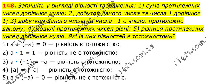 Запишіть у вигляді рівності твердження: 1) сума протилежних чисел дорівнює нулю; 2) добуток даного числа та числа 1 дорівнює 1; 3) добутком даного числа та числа –1 є число, протилежне даному; 4) модулі протилежних чисел рівні; 5) різниця протилежних чисел дорівнює нулю. Які із цих рівностей є тотожностями? 1) а + (–а) = 0 — рівність є тотожністю; 2) а ∙ 1 = 1 — рівність не є тотожністю; 3) а ∙ (–1) = –а — рівність є тотожністю; 4) |а| = |–а| — рівність є тотожністю; 5) а – (–а) = 0 — рівність не є тотожністю.