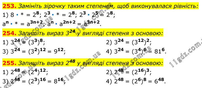 253. Замініть зірочку таким степенем, щоб виконувалася рівність: 1) 8 ∙ * = 28; 23 ∙ * = 28; 23 ∙ 25 = 28; an ∙ * = a3n+2; an ∙ a2n+2 = a3n+2. 254. Запишіть вираз 324 у вигляді степеня з основою: 1) 324 = (33)8; 3) 324 = (32)12 = 912; 2) 324 = (312)2; 4) 324 = (34)6 = 816. 255. Запишіть вираз 248 у вигляді степеня з основою: 1) 248 = (24)12; 3) 248 = (23)16 = 816; 2) 248 = (216)3; 4) 248 = (26)8 = 648.