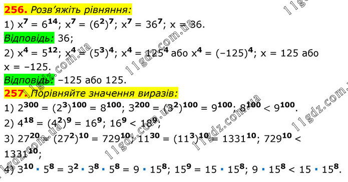 256. Розв’яжіть рівняння: 1) x7 = 614; x7 = (62)7; x7 = 367; x = 36. Відповідь: 36; 2) х4 = 512; х4 = (53)4; х4 = 1254 або х4 = (–125)4; х = 125 або х = –125. Відповідь: –125 або 125. 257. Порівняйте значення виразів: 1) 2300 = (23)100 = 8100; З200 = (32)100 = 9100; 8100 < 9100. 2) 418 = (42)9 = 169; 169 < 189; 3) 2720 = (272)10 = 72910; 1130 = (113)10 = 133110; 72910 < 133110; 4) З10 ∙ 58 = З2 ∙ З8 ∙ 58 = 9 ∙ 158; 159 = 15 ∙ 158; 9 ∙ 158 < 15 ∙ 158.