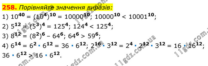 Порівняйте значення виразів: 1) 1040 = (104)10 = 1000010; 1000010 < 1000110; 2) 512 = (53)4 = 1254; 1244 < 1254; 3) 812 = (82)6 – 646; 646 > 596; 4) 614 = 62 ∙ 612 = 36 ∙ 612; 216 ∙ З12 = 24 ∙ 212 ∙ З12 = 16 ∙ 1612; 36 ∙ 612 > 16 ∙ 612.