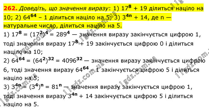 Доведіть, що значення виразу: 1) 178 + 19 ділиться націло на 10; 2) 6464 – 1 ділиться націло на 5; 3) 34n + 14, де n — натуральне число, ділиться націло на 5. 1) 178 = (172)4 = 2894 — значення виразу закінчується цифрою 1, тоді значення виразу 178 + 19 закінчується цифрою 0 і ділиться націло на 10; 2) 6464 = (642)32 = 409632 — значення виразу закінчується цифрою 6, тоді значення виразу 6464 – 1 закінчується цифрою 5 і ділиться націло на 5; 3) З4n = (З4)n = 81n — значення виразу закінчується цифрою 1, тоді значення виразу З4n + 14 закінчується цифрою 5 і ділиться націло на 5.