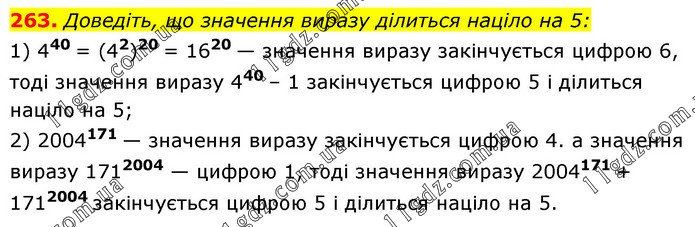 Доведіть, що значення виразу ділиться націло на 5: 1) 440 = (42)20 = 1620 — значення виразу закінчується цифрою 6, тоді значення виразу 440 – 1 закінчується цифрою 5 і ділиться націло на 5; 2) 2004171 — значення виразу закінчується цифрою 4. а значення виразу 1712004 — цифрою 1, тоді значення виразу 2004171 + 1712004 закінчується цифрою 5 і ділиться націло на 5.
