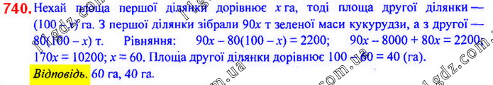740. Загальна площа двох ділянок, засіяних кукурудзою, дорів-нює 100 га. На першій ділянці зібрали по 90 т зеленої маси кукуру-дзи з 1 га, а на другій — по 80 т. Знайдіть площу кожної ділянки, якщо з першої ділянки зібрали на 2200 т більше, ніж із другої.