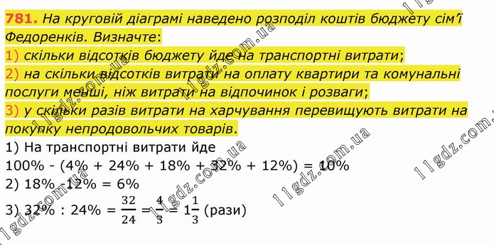 781. На круговій діаграмі (рис. 11) наведено розподіл коштів бю-джету сім’ї Федоренків. Визначте: 1) скільки відсотків бюджету йде на транспортні витрати; 2) на скільки відсотків витрати на оплату квартири та кому-нальні послуги менші, ніж витрати на відпочинок і розваги; 3) у скільки разів витрати на харчування перевищують витрати на покупку непродовольчих товарів.