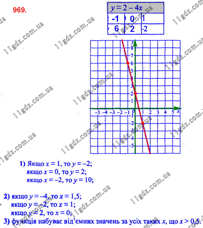 Побудуйте графік функції y = 2 – 4x. Користуючись графіком, знайдіть: 1) значення функції, якщо значення аргументу дорівнює: 1; 0; –2; 2) значення аргументу, при якому значення функції дорівнює: –4; – 2; 2; 3) значення аргументу, при яких функція набуває від’ємних значень.