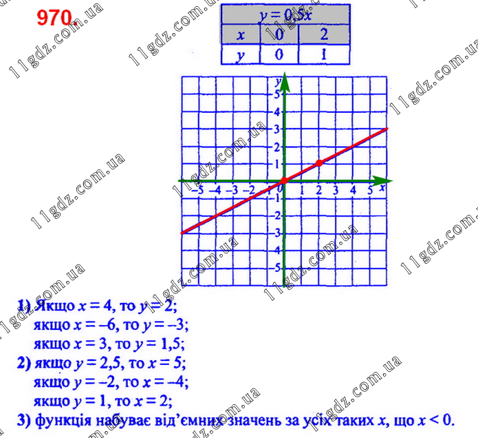 Побудуйте графік функції y = 0,5x. Користуючись графіком, знайдіть: 1) значення функції, якщо значення аргументу дорівнює: 4; –6; 3; 2) значення аргументу, при якому значення функції дорівнює: 2,5; –2; 1; 3) значення аргументу, при яких функція набуває від’ємних значень.