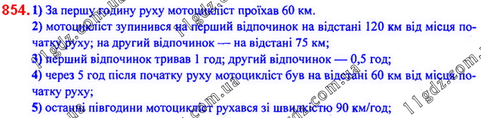 Мотоцикліст виїхав із дому й через деякий час повернувся. На рисунку 17 зображено графік зміни відстані від мотоцикліста до дому залежно від часу (графік руху мотоцикліста). Корис-туючись графіком, визначте: 1) яку відстань проїхав мотоцикліст за першу годину руху; 2) на якій відстані від місця початку руху мотоцикліст зупинився відпочити першого разу; другого разу; 3) скільки часу тривала перша зупинка; друга зупинка; 4) на якій відстані від дому був мотоцикліст через 5 год після початку руху; 5) з якою швидкістю рухався мотоцикліст останні півгодини.