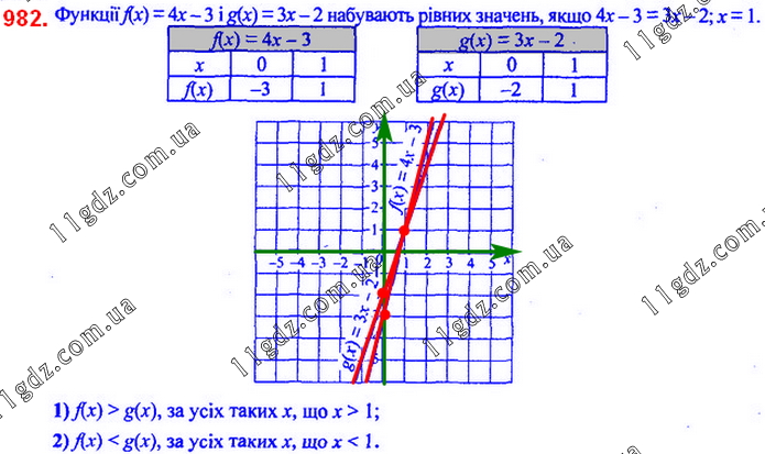 При якому значенні змінної x функції f (x) = 4x – 3 і g (x) = 3x – 2 набувають рівних значень? Побудуйте на одній коор-динатній площині графіки функцій f і g. Визначте, при яких значеннях x:
