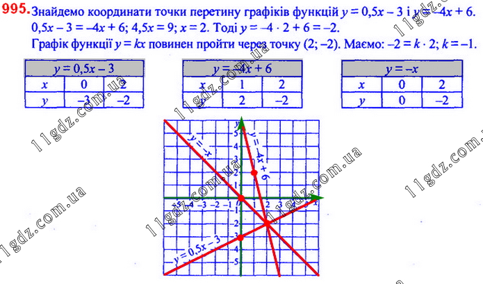 Графіки функцій y = 0,5x – 3, y = –4x + 6 і y = kx перетинаються в одній точці. Знайдіть значення k. Побудуйте в одній системі координат графіки цих функцій.