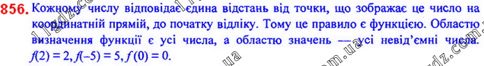 Кожному числу поставили у відповідність відстань від точки, що зображає це число на координатній прямій, до початку від-ліку. Поясніть, чому описане правило є функцією. Знайдіть її область визначення та область значень. Позначивши цю функцію буквою f, знайдіть f (2), f (–5), f (0).