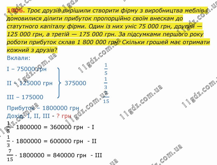 Троє друзів вирішили створити фірму з виробництва меблів і домовилися ділити прибуток пропорційно своїм внескам до статутного капіталу фірми. Один із них уніс 75 000 грн, другий — 125 000 грн, а третій — 175 000 грн. За підсумками першого року роботи прибуток склав 1 800 000 грн. Скільки грошей має отримати кожний з друзів?